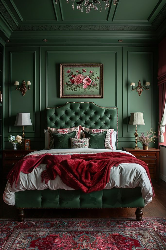 Introduce a layer of undeniable luxury and tactile richness by incorporating velvet in verdant shades of green. Using this sumptuous fabric for a headboard, accent chair, or drapery instantly elevates the space. The way light plays on the texture of dark green velvet adds depth and dimension, making the room feel both regal and incredibly inviting. This single material choice can transform your bedroom into a sophisticated and opulent haven, perfect for indulgent relaxation.