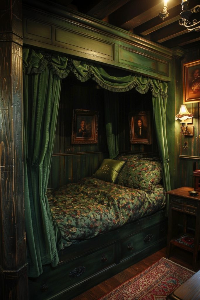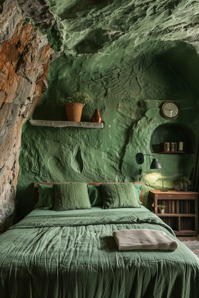 Create a mysterious and enchanting grotto-like ambiance in your bedroom with deep green shades and unique, cave-like decor elements. Paint the walls in a very dark, wet-looking green and use dim, strategic lighting to create pockets of light and shadow. Incorporate natural textures like rough stone or textured wallpaper to enhance the grotto feel. This mysterious and intimate theme invites you to unwind in a personal sanctuary that feels hidden away from the rest of the world.