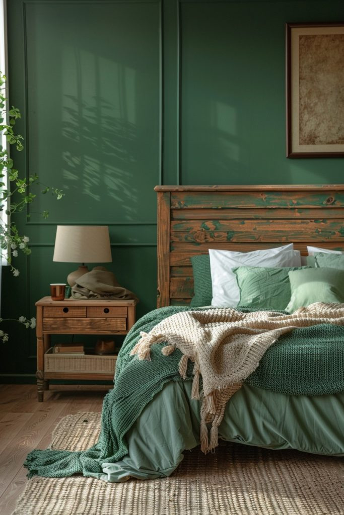 Transform your bedroom into a serene escape that mimics the quiet, peaceful feeling of a dense forest. Choose a dark green shade that reminds you of deep woods and use it to create a calming, cocoon-like effect. This theme is perfectly complemented by natural wood elements, such as a reclaimed wood bed frame or rustic nightstands. Incorporate subtle earth tones in your bedding and rugs to enhance the connection to nature. The result is a grounded, tranquil space that encourages you to disconnect from the busy world and find rest.