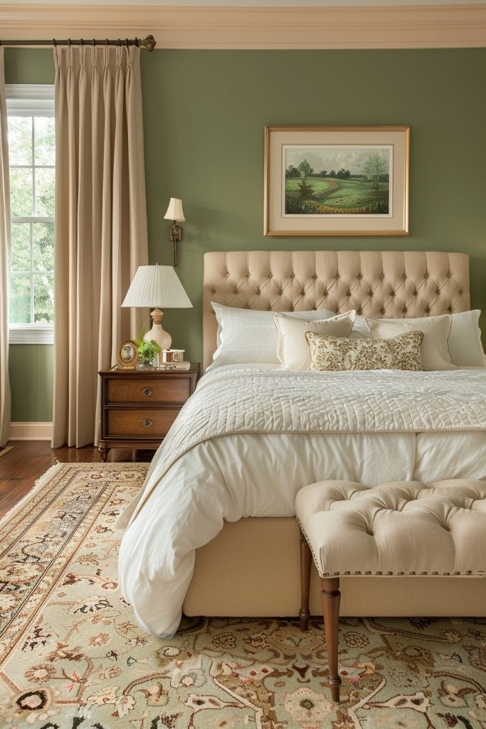 For a softer yet equally rich alternative, consider the versatile and soothing hue of olive green. This sophisticated color is ideal for creating a tranquil bedroom environment that feels both earthy and chic. Olive green has a unique warmth that pairs beautifully with muted golds, warm creams, or soft beige tones for a sophisticated and layered look. It’s a timeless choice that can adapt to both modern and traditional decor styles, offering a peaceful and elegant backdrop for your personal dreamspace.
