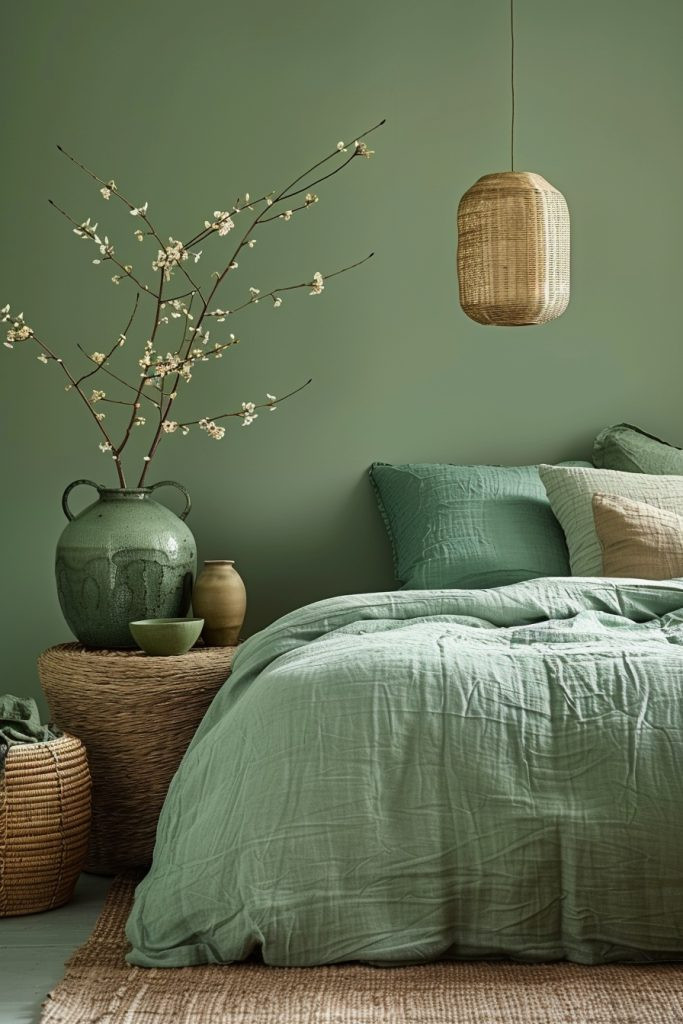 Create a soft, gentle, and enveloping atmosphere with the earthy tones of moss green. This color is perfect for designing a bedroom that feels like a peaceful, nature-inspired nook. Its soft, muted quality pairs beautifully with light-colored woods like birch or ash, enhancing its organic feel. To complete the gentle aesthetic, add subtle floral accents through artwork or patterned textiles. This design fosters a calming and nurturing environment, making your bedroom a true sanctuary for rest and relaxation.