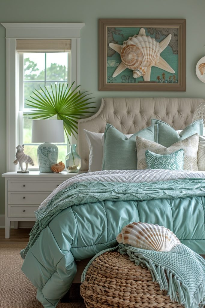For a unique, oceanic twist, consider the mysterious and beautiful shade of dark seaweed green. This deep, complex color evokes the depths of the sea, bringing a sense of natural wonder into your bedroom. This theme pairs beautifully with other marine-inspired elements, such as decor made from driftwood, accents in sandy beige tones, and art depicting coastal scenes. The result is a sophisticated and moody take on a coastal look, creating a suite that feels both intriguing and deeply calming.
