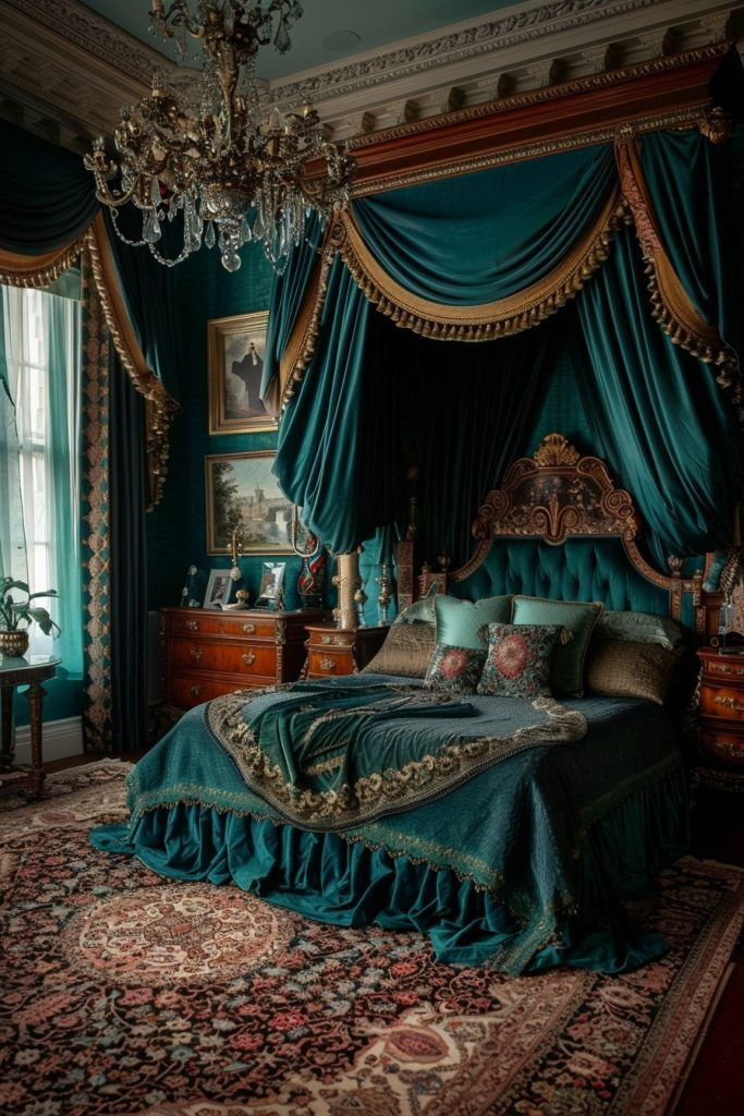 Create a regal and imposing atmosphere suitable for a grand, traditional bedroom setting. The Teal Majesty Room uses dark teal to evoke a sense of power and elegance. This is enhanced by extensive use of luxurious textures like velvet and silk, along with ornate, classic furniture pieces. Gold or silver accents are used generously to add a further layer of opulence, making this the perfect design for those who enjoy a touch of royal splendor.