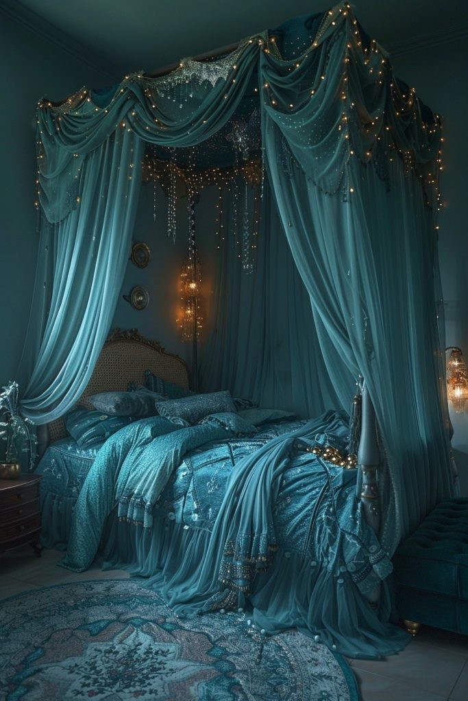 Create a dreamy, whimsical, and magical atmosphere with a softer take on the dark teal bedroom. Teal Dreamland uses soft, diffused lighting and delicate fabric textures to craft an ethereal space. Think light, gauzy draperies, shimmering metallic accents, and perhaps decorative elements like star-patterned cushions or glowing orb lamps. This design is perfect for those who want to escape to a soothing, fantasy-like environment each night.