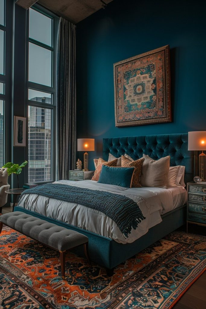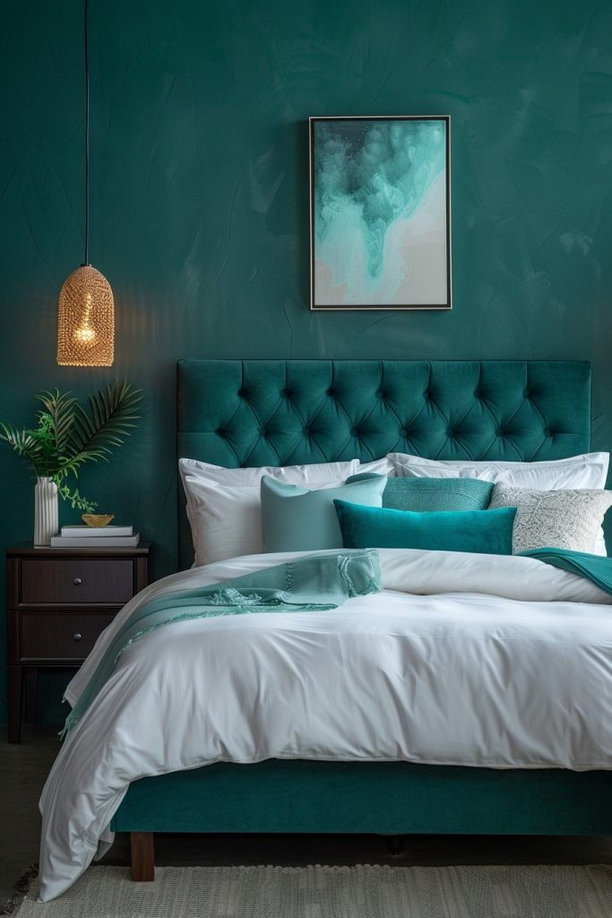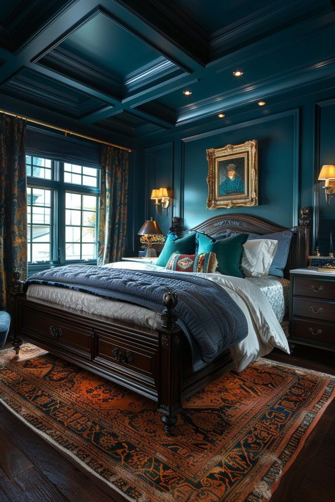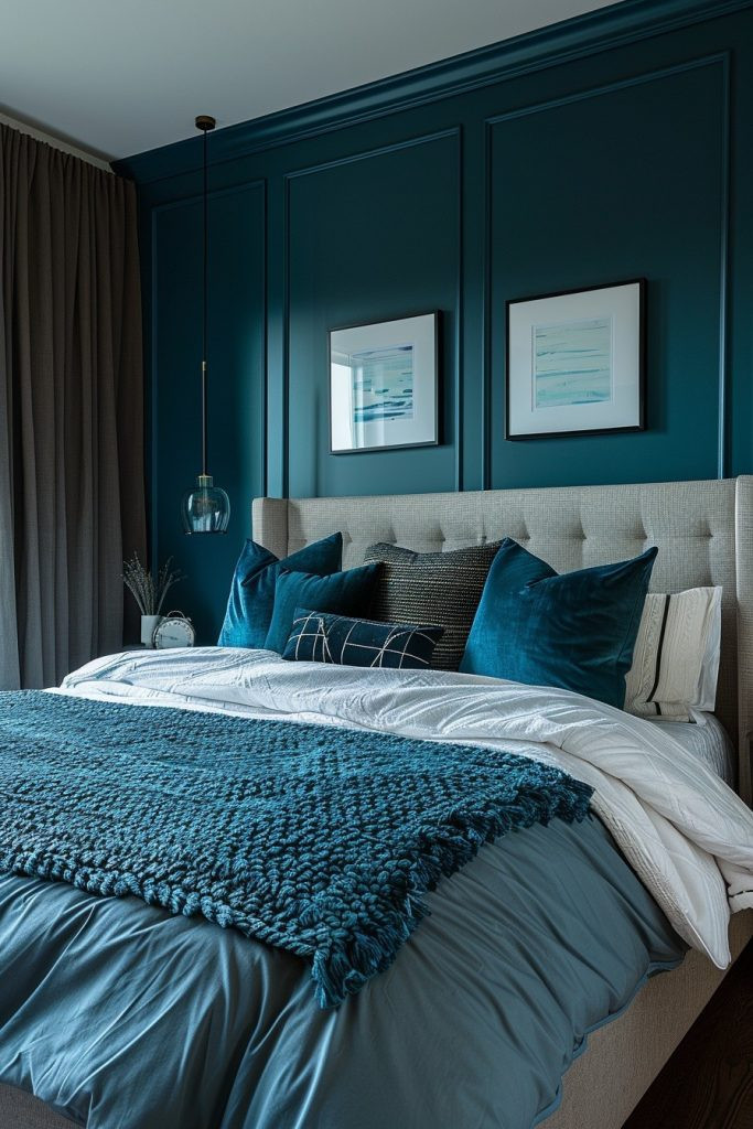 Incorporate elements of classic, sophisticated design to create a Regal Teal Respite. This bedroom features luxurious details like intricate wall moldings or rich, patterned fabrics set against a backdrop of dark teal. The boldness of the wall color is softened by lighter accents in the bedding and curtains, creating a perfectly balanced and refined aesthetic. Sumptuous textiles and elegant accessories add a sense of luxury, making the bedroom feel like a lavish escape.