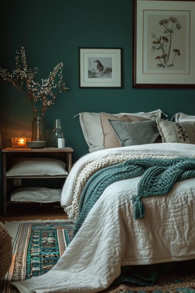 Create a charming and cozy bedroom by using dark teal as a backdrop for quaint, traditional decor. The Teal Charm Bedroom might feature floral or paisley patterns in the soft furnishings, which adds a touch of classic charm against the bold wall color. Warm wooden furniture and vintage-inspired accessories enhance the room’s inviting appeal, making it a perfect blend of modern color and traditional comfort.