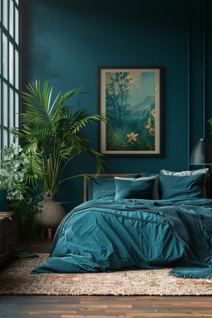 This approach focuses purely on creating a peaceful and serene atmosphere for the most restful night’s sleep. The Teal Serenity Bedroom uses dark teal on the walls but balances it with soft, natural fabrics in light, airy colors like off-white or pale gray. This gentle contrast enhances the tranquil vibe. Minimalistic decor and clean, uncluttered surfaces are key to maintaining the room’s calm and orderly feel, making it a true retreat from the world.