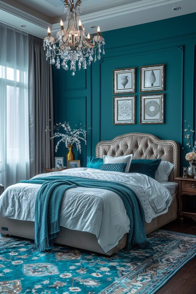 Combine dark teal with unapologetically glamorous elements to create a chic and highly sophisticated space. The Teal Glamour Chamber features mirrored furniture, crystal chandeliers, and faux fur throws. These glamorous details enhance the depth of the teal, making the room feel luxurious and fashionable. It’s a design for those who appreciate the finer things in life and want their bedroom to be a reflection of their fabulous style.