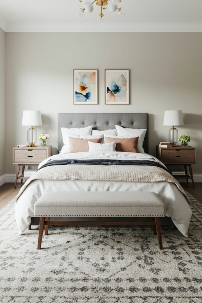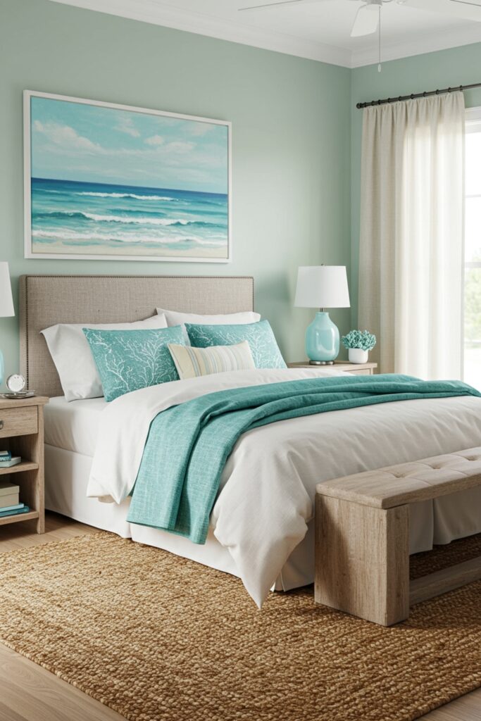 Bring the serene, calming presence of the sea indoors with an Oceanic Oasis. This dream bedroom inspiration uses a soothing palette of soft blues, gentle seafoam greens, and warm sandy neutrals to create a tranquil retreat. It’s perfect for beach lovers, subtly featuring seashell and coral motifs in artwork or textile patterns. Maximize natural light to illuminate the peaceful color scheme, reminiscent of a sunlit shore. Incorporate textural elements like woven jute rugs, airy linen curtains, and smooth driftwood accents to enhance the coastal vibe, crafting a perfect escape from everyday stresses.