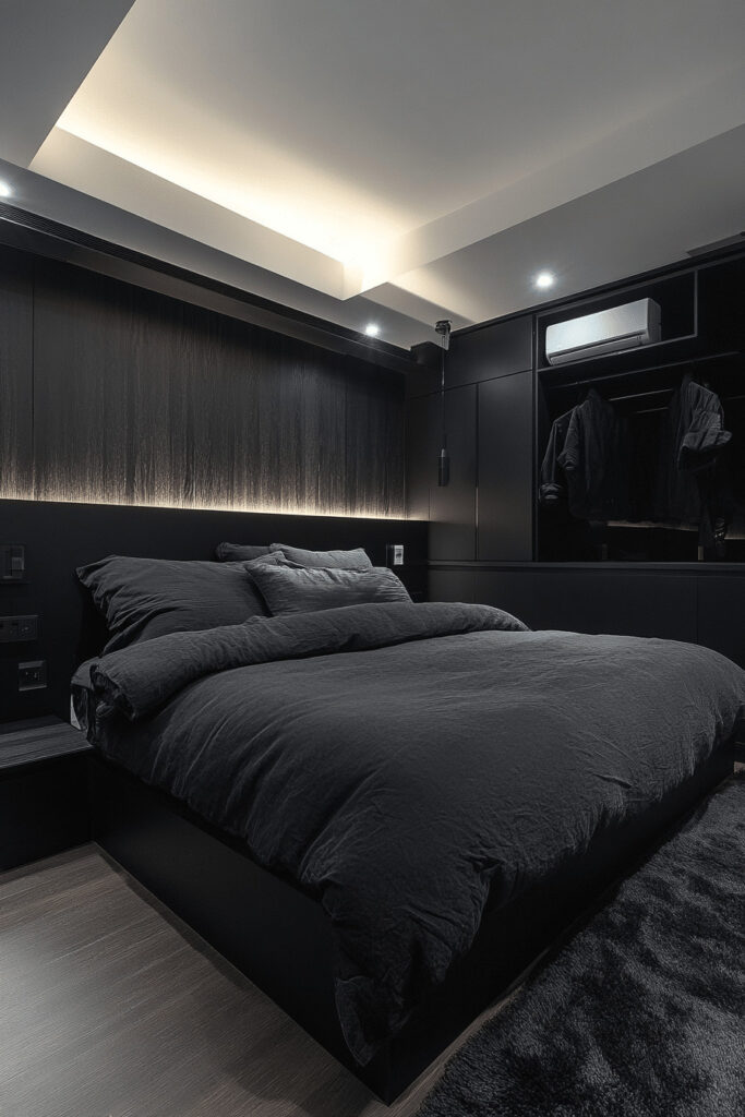 Design a modern, sophisticated, and subtly dramatic space with a Chic Charcoal Loft. This dream bedroom inspiration appeals to those who favor contemporary elegance and moody aesthetics, featuring a monochromatic charcoal color scheme. Introduce sleek, minimalist furniture, high end materials like brushed metal or dark wood, and carefully curated decor. The strategic use of different textures, from smooth, matte finishes to soft, touchable fabrics, adds depth and visual interest to the monochrome palette. Strategic lighting and perhaps a few reflective surfaces create a dynamic yet refined atmosphere.