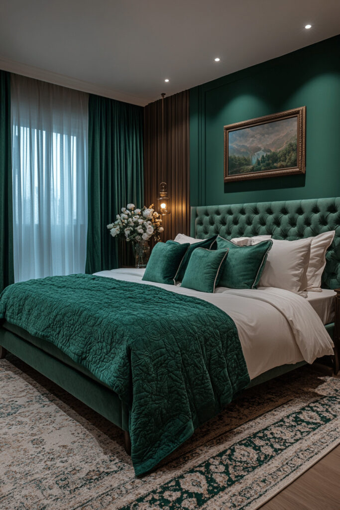 Soothe your senses and create a refined sanctuary with an Elegant Emerald Enclave. This dream bedroom inspiration focuses on the calming and luxurious qualities of green, particularly rich emerald tones. These are beautifully combined with luxurious textures like smooth velvet, shimmering satin, or soft silk to create an elegant and deeply inviting environment. Subtle classic patterns, antique brass accents, and timeless decor enhance the room’s sophistication, while soft, layered lighting and plush furnishings encourage relaxation and quiet contemplation in this opulent yet tranquil space.