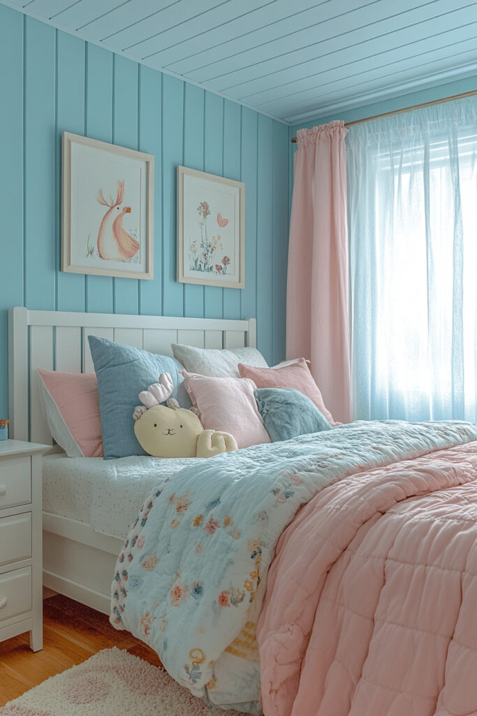 Soothe the senses and delight the eye with a Soft Pastel Playground. This dreamy bedroom uses gentle, calming hues of blush pink, powder blue, mint green, and lavender to create a playful yet deeply tranquil space. Ideal for those who appreciate the softness and subtlety of pastel colors, it can feature whimsical decor, plush, comforting textiles, and light toned wooden or painted furniture. The room is designed to be both comforting and cheerful, with charming decorative accents that add a touch of lighthearted whimsy.