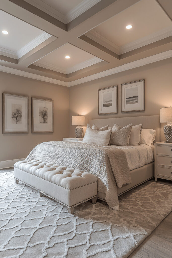 Calm the mind and create an atmosphere of understated elegance with a Tranquil Taupe Tower. This dream bedroom inspiration utilizes a soothing palette of soft taupe, creamy whites, and gentle beige tones to establish a serene and sophisticated environment. Appealing to those who seek simplicity and refinement, it often features classic furniture silhouettes, subtle textural patterns rather than bold prints, and soft, layered lighting that enhances the peaceful ambiance. The use of natural materials and a muted color scheme promotes deep relaxation.
