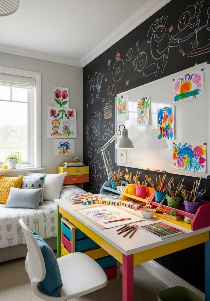Imagine a vibrant and inspiring bedroom where your child’s creativity can truly flourish. This idea focuses on creating a dedicated space for artistic expression within their bedroom. Think about including a large, easily cleanable art desk with ample storage for paints, brushes, and paper. A wall covered in chalkboard paint or a large magnetic whiteboard can serve as a canvas for their daily masterpieces. Bright, natural light is essential, complemented by adjustable task lighting. Inspirational artwork and perhaps a small display area for their finished pieces will encourage their artistic journey, making the room a true haven for young creators.