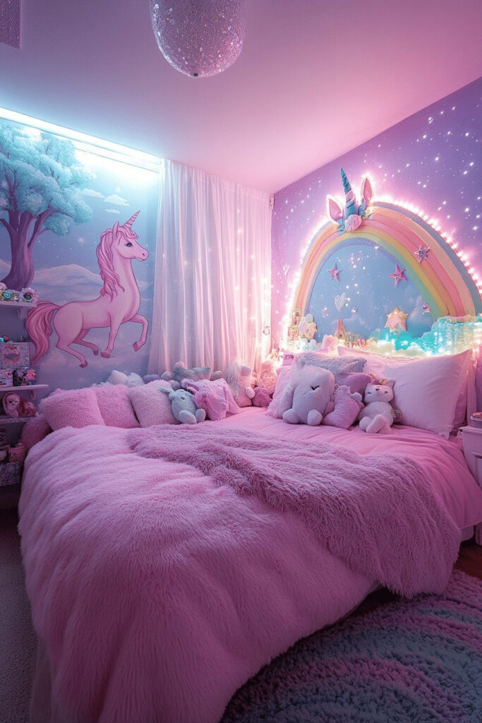 Create a Magical Unicorn Sanctuary that any child will adore. This whimsical bedroom uses soft pastel rainbows, glittering stars, and charming unicorn motifs to spark joy and creativity. Plush unicorn toys and a whimsical wall-mounted unicorn head bring the fantasy to life. Soft, flowing fabrics mimic a magical landscape, perfect for dreamy afternoons filled with wonder and imagination.