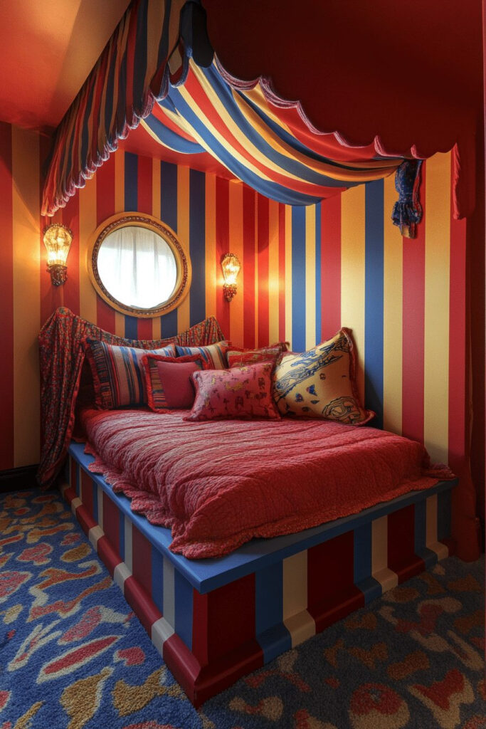 A Circus Fun House Room makes for a vibrantly themed bedroom that’s full of energy and cheer. Bright colors, playful stripes, and patterns reminiscent of a circus tent set a lively mood. Decorations such as juggling balls, fun clown posters, and a small tent can make kids feel like they’re part of the show. Soft, plush cushions ensure comfort and safety during all their playful activities.
