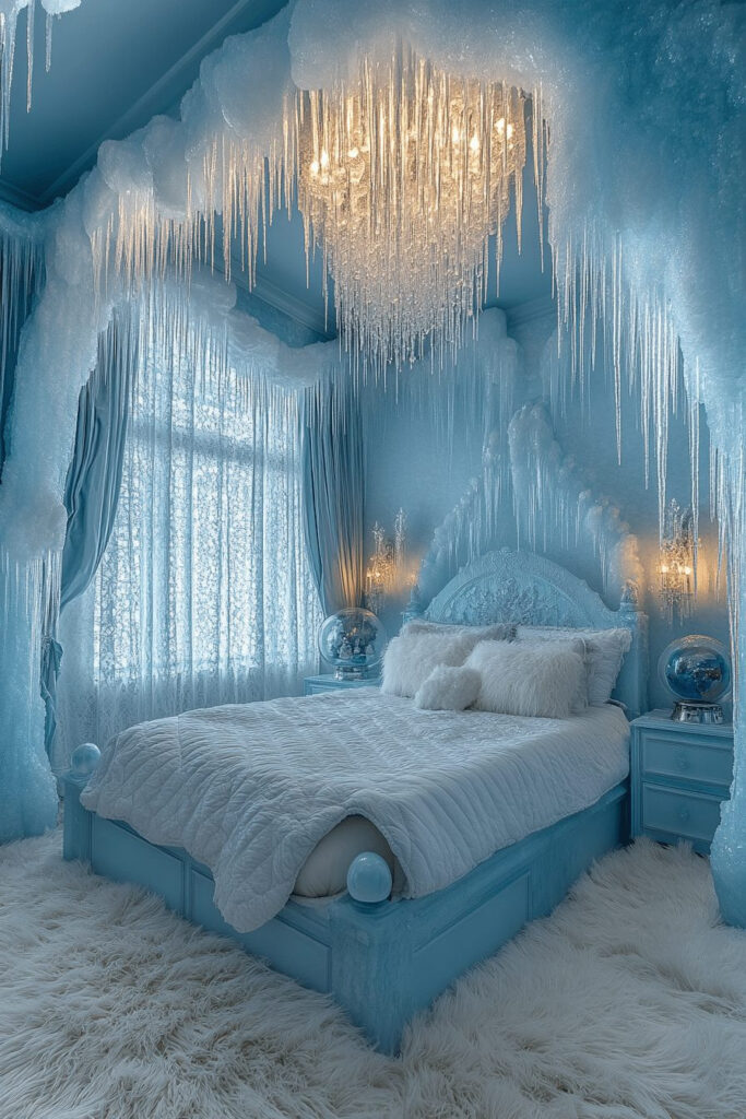 Design a Frozen Winter Wonderland for a whimsical bedroom that kids will absolutely love, especially if they are fans of snowy landscapes and icy adventures. Snowflake decorations, icy blue and white decor, and a charming sleigh bed create a cool yet cozy atmosphere. Soft, fluffy rugs and blankets mimic snow and add essential warmth. Glittering lights can represent stars in the crisp winter sky, making the room truly magical.