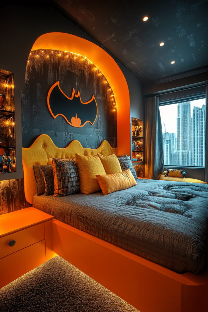 Create a Dragon’s Lair Den, a whimsical bedroom for kids captivated by mythical creatures and ancient stories. Deep reds and golds, striking dragon-themed artwork, and a castle-like bed frame make for a mystical retreat. Incorporate elements like a faux dragon egg or a dragon-shaped lamp to spark the imagination. Warm, ambient lighting can enhance the mysterious mood, perfect for epic tales.