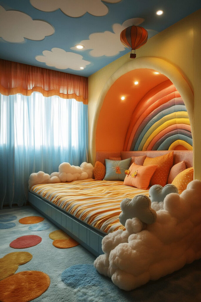 Create a Rainbow Sky Dreamland for a whimsical bedroom that bursts with color and happiness. This room features a beautiful ceiling mural of a rainbow and fluffy, cloud-like pillows and bedding for a truly dreamy effect. Bright, colorful furniture and playful rainbow accessories enhance the vibrant theme. Soft lighting complements the cheerful colors, making the space feel warm and wonderfully inviting.