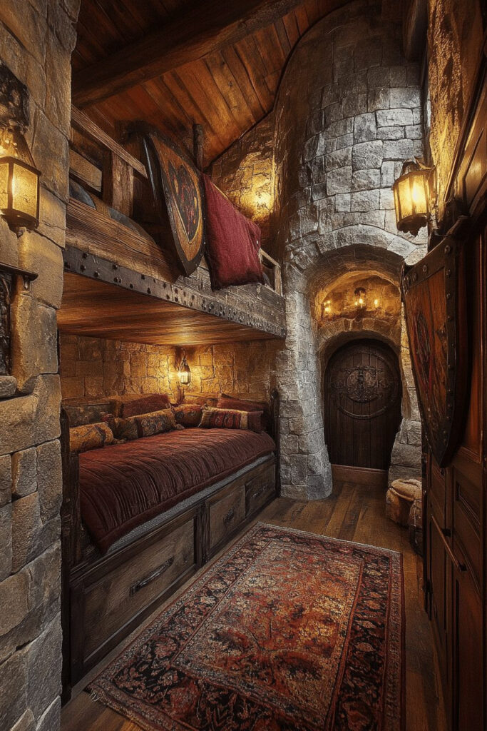 A Knight’s Medieval Fortress is a whimsical bedroom for kids fascinated by chivalry and medieval tales. Stone wall decals, a grand castle bunk bed, and heraldic banners set a noble scene. Accessories like toy swords, shields, and armor can be both decorative and inspirational for imaginative play. Earthy tones and heavy fabrics add to the authentic medieval atmosphere, making kids feel like true knights.