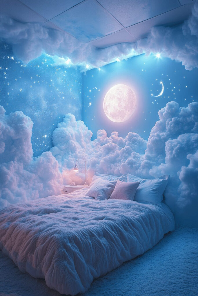Design a Cloud Nine Sky Room for a whimsical bedroom that truly feels like floating among the clouds. Soft blues and whites, cloud-shaped pillows, and airy curtains create a light and breezy atmosphere. A hanging chair or even a unique hanging bed can simulate the sensation of floating among the clouds. Gentle lighting enhances the soft, ethereal theme, making it a peaceful haven.