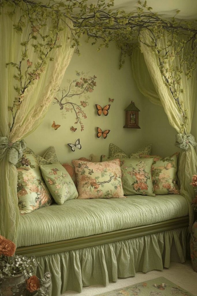 Create a Butterfly Garden Nook, a whimsical bedroom for kids enchanted by butterflies and the beauty of nature. Pastel colors, delicate butterfly wall decals, and elegant floral patterns set a gentle, garden-like atmosphere. Sheer curtains and a canopy bed can mimic a graceful gazebo or a garden trellis. Soft, ambient lighting complements the peaceful setting, creating a serene and magical space.