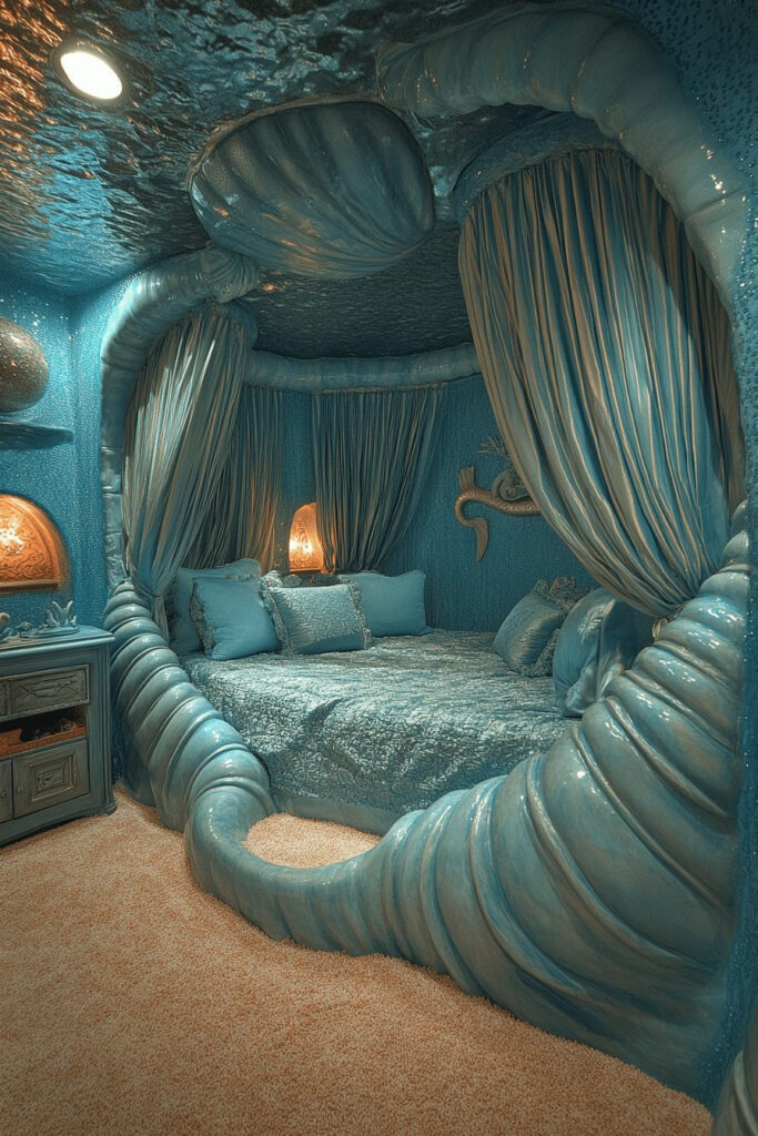 Transform your child’s room into an Underwater Mermaid Lagoon, a whimsical bedroom that dives deep into the ocean’s wonders. Aquatic wall murals, a beautiful shell-shaped bed, and hanging fish nets create an enchanting undersea environment. Use various shades of blue and green to evoke the feeling of water, and include shimmering fabrics for a touch of mermaid magic. Oceanic soundtracks can further enhance the immersive underwater feel.