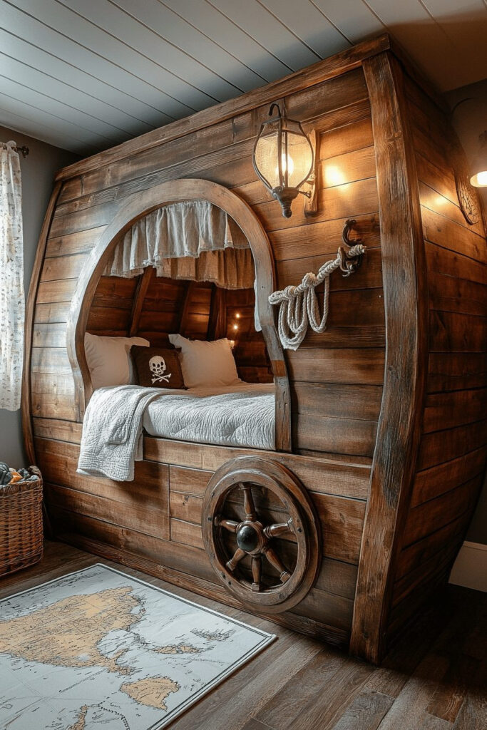 For kids who dream of sailing the seven seas, the Pirate Ship Adventure Room is the ultimate whimsical escape. This bedroom is outfitted with a ship-shaped bed and oceanic blue walls, truly feeling like a captain’s quarters on the high seas. Nautical decorations, including a helm wheel and exciting treasure map wall murals, boost the adventurous spirit. A hanging net for stuffed animals or a faux wooden plank adds fun, playful touches, inviting young pirates to embark on countless imaginary voyages.