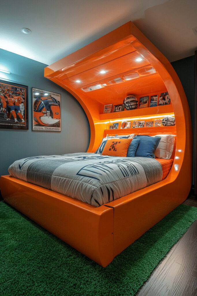 Design a Sports Arena Champions Room, a whimsical bedroom for young sports enthusiasts and future champions. Locker-style storage, a cool scoreboard decoration, and bedding that resembles a sports uniform set an athletic scene. Mini basketball hoops or soccer nets can provide active play opportunities right in their room. Bright, even lighting ensures the room is well-lit for all their indoor games and practice sessions.