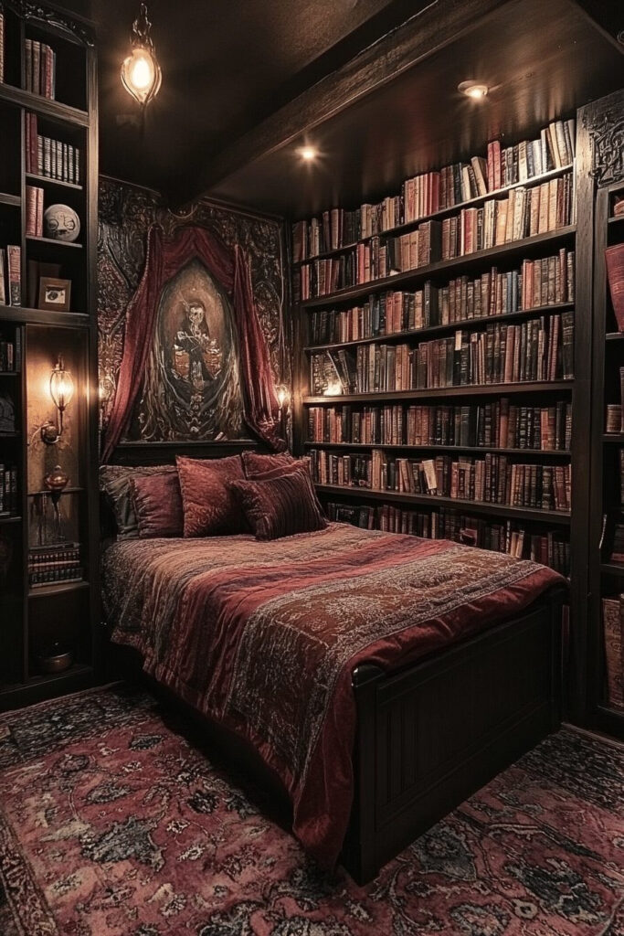 Create a Mystic Wizard’s Library, a whimsical bedroom for kids who love magic and mystery. Bookshelves filled with enchanting fantasy books, a secret door bookcase, and mystical decor like glowing orbs and wands set a magical mood. A canopy bed with starry curtains can simulate a wizard’s secret chamber. Dim, atmospheric lighting enhances the mysterious ambiance, perfect for spells and quiet reading.