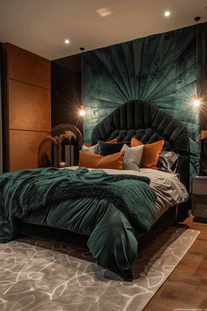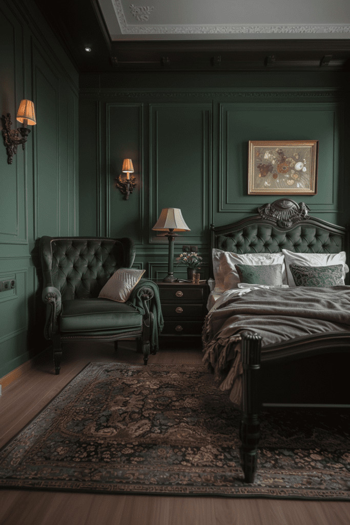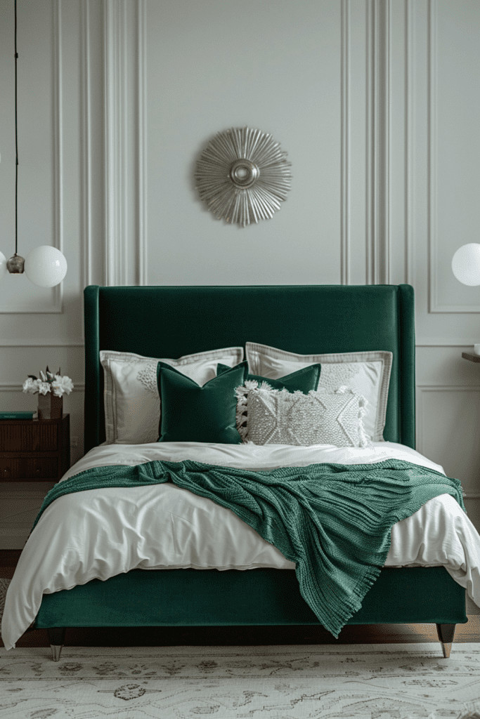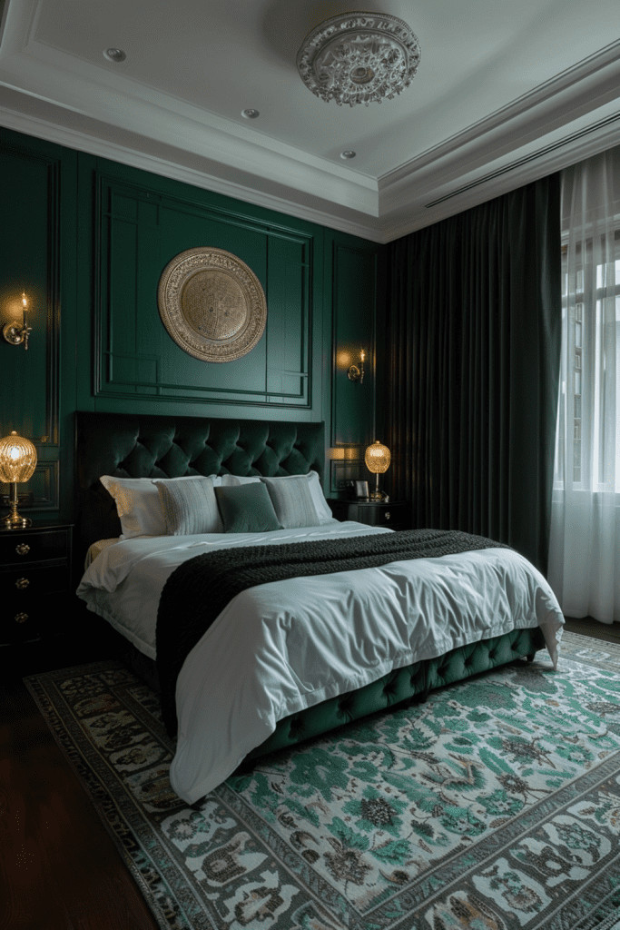For those who appreciate a darker, more intimate, and atmospheric approach to design, an emerald twilight bedroom is ideal. This style uses deep, dark emerald walls to create a cozy, enveloping feel. The key is the lighting; choose dramatic Art Deco light fixtures, like sculptural sconces or a tiered chandelier, that cast beautiful, moody shadows across the room. This setting feels mysterious and sophisticated, perfect for creating an intimate and deeply relaxing sanctuary away from the bright lights of the outside world.