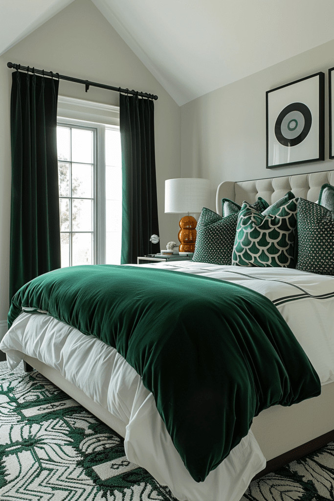 Embrace the sleek, forward-looking “streamline moderne” aesthetic of later Art Deco with a more minimalist approach. This bedroom design focuses on clean lines, smooth surfaces, and functional beauty. Choose minimalist furniture with curved edges and a lack of ornamentation. The emerald green is used as a powerful accent, perhaps on a single feature wall, a sleek upholstered headboard, or a pair of elegant chairs. This is a perfect modern interpretation of the Art Deco style, celebrating its elegance in a more understated and contemporary way.