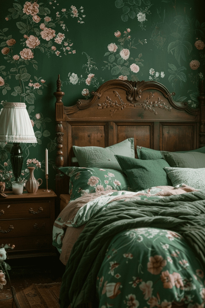 Bring the stylized beauty of nature indoors with a floral-themed Art Deco bedroom. In the Art Deco period, floral motifs were often stylized and geometric. Use a wallpaper that features these kinds of bold, graphic floral prints set against an emerald green backdrop. This botanical inspiration adds a fresh, natural touch to the luxurious Deco style, blending the organic world with the era’s love for pattern and symmetry. It’s a beautiful way to soften the hard edges of the style with a touch of nature’s elegance.