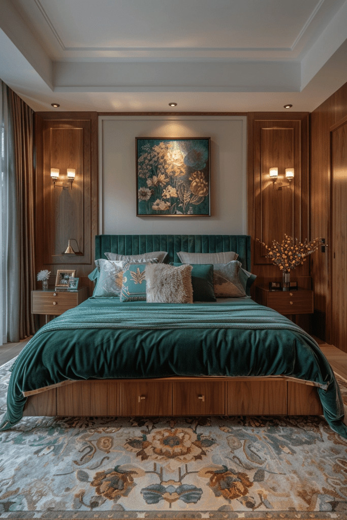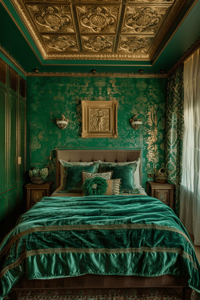Create a truly regal atmosphere with a majestic blend of emerald green and luxurious metallics, designed to make you feel like royalty. This bedroom design uses intricate, repeating fan or geometric patterns on wallpaper or textiles. The emerald green is deep and commanding, paired with lush materials like silk and brocade. Gold is used generously in lighting fixtures, furniture trim, and decorative objects to evoke a sense of royal splendor. This is Art Deco sophistication at its most grand and majestic, creating a palatial personal retreat.