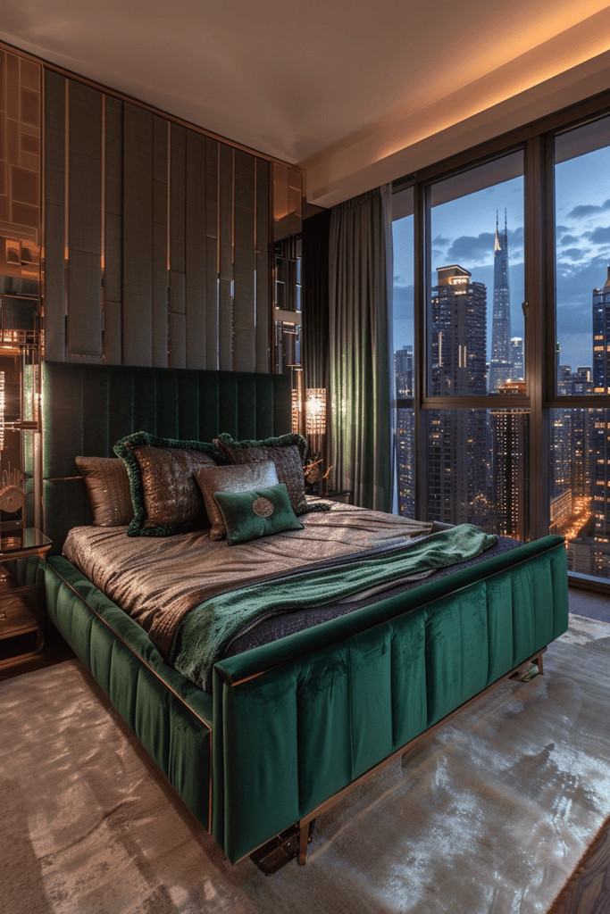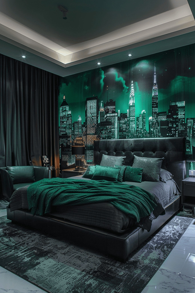 Merge the sophistication of Art Deco with the energy of urban life in a bedroom that features emerald green tones against a cityscape theme. This could be achieved with a large, stylized mural of a 1920s city skyline, perhaps in black and gold, on one wall. The lush emerald green is then used in the furniture and textiles to provide a rich color contrast. This design is ideal for city dwellers, blending the architectural elegance of the city with the lush, deep color of a hidden park, creating a truly unique urban sanctuary.