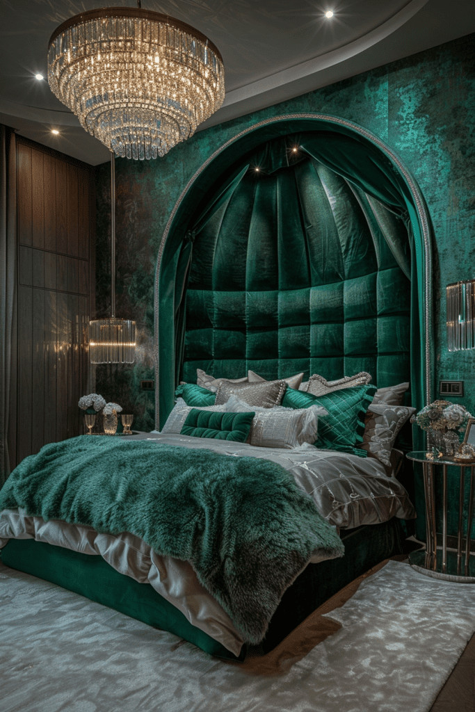Create an incredibly lush and luxurious bedroom by focusing on an abundance of plush emerald green textures. This design is all about delivering a truly decadent and sensory Art Deco experience. Imagine sinking your feet into a deep-pile emerald green carpet that covers the entire floor. Heavy, opulent velvet drapes block out the world, while the bed is a lavish pile of smooth satin sheets and rich velvet cushions. This commitment to opulent texture creates a space that feels incredibly comfortable, private, and unapologetically glamorous.