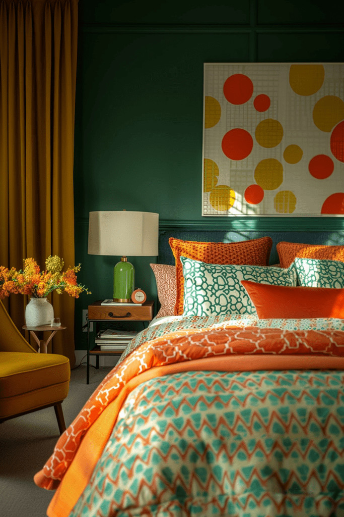 Revive the past with a fun and energetic retro Art Deco bedroom that uses bright, clear emerald hues and bold, graphic geometric patterns. This vibrant setup celebrates the most lively and playful aspects of the Art Deco style. Don’t be afraid to use large-scale patterns on your walls or bedding. This approach is all about high-contrast and high-energy design, bringing a sense of flair, fun, and historical glamour to your personal space, perfect for someone with a vibrant and outgoing personality.