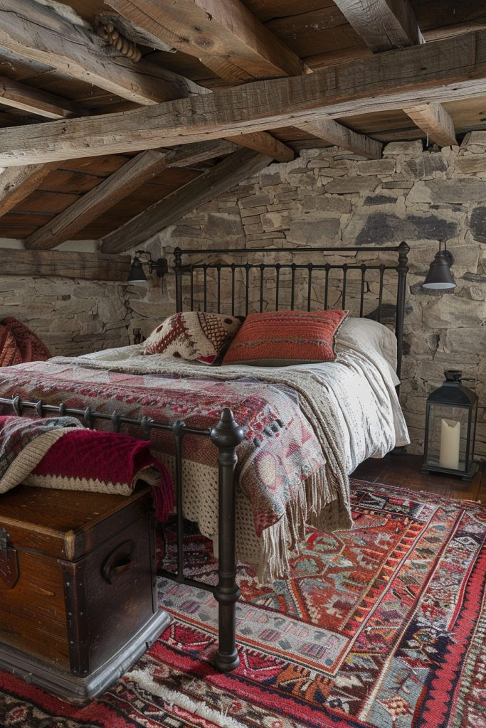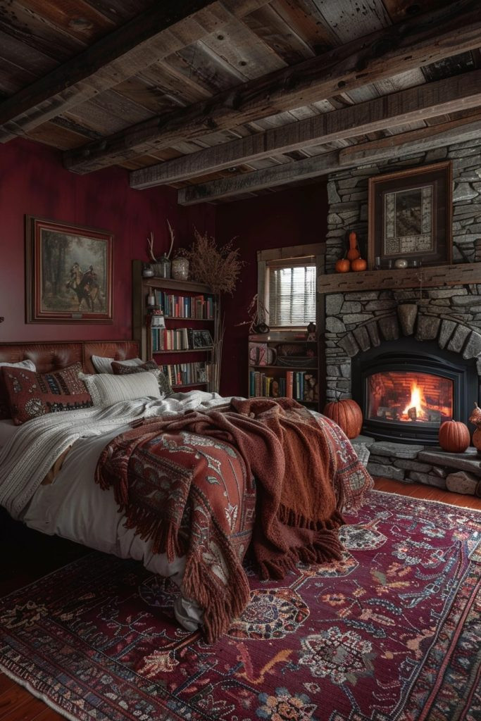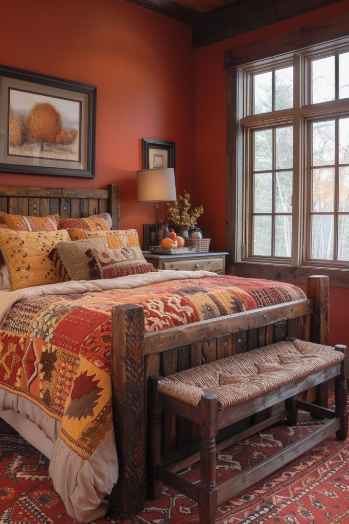 This fall bedroom is styled with a rustic charm that reflects a beautiful woodland setting in autumn. It might feature heavy flannel fabrics in a plaid pattern, a sturdy wrought iron or reclaimed wood bed frame, and distressed wood furniture that has a sense of history. Decorative elements like antique-style lanterns (with LED candles) and dried wreaths made from twigs and leaves help to bring the outdoors in. The use of warm, low lighting casts a soft glow that’s perfect for the season.