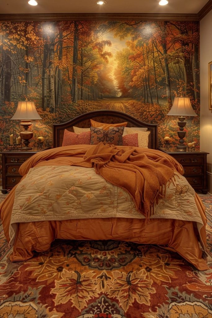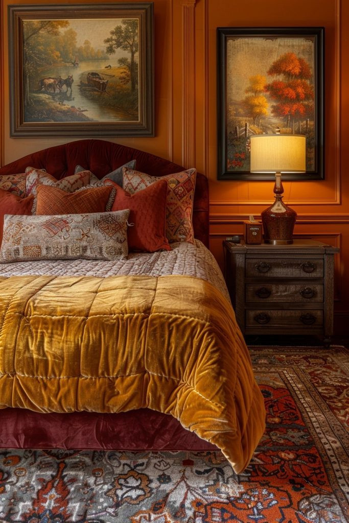 An Autumnal Elegance Room is a fall bedroom that combines the warmth of the season with a more sophisticated and elegant style. Rich textiles in shades of burgundy and forest green create a luxurious feel, complemented by elegant, dark wooden furniture. Crystal vases filled with late autumn blooms like dahlias or chrysanthemums can add a touch of refinement. Soft, diffused lighting and velvet throws make the space feel both inviting and high-end.