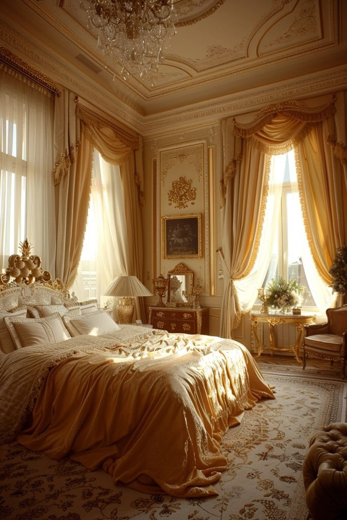 The Golden Glow bedroom captures the magical essence of golden autumn sunlight with its generous use of gold and amber accents. Sheer curtains on the windows allow the low-angled natural light of fall to enhance the golden hues during the day. Soft, plush bedding ensures comfort as the temperature drops, and decorative pillows in gold or amber tones add a luxurious touch. A small, elegant chandelier or brass lamps can provide a beautiful, warm evening light.