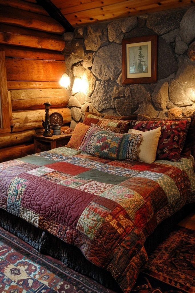 A Cozy Cabin Nook is a bedroom designed to replicate the snug, secure feel of a mountain retreat. Classic tartan or plaid patterns and furniture made from rich, dark wood anchor the design in comfort and tradition. A faux fur throw draped over the bed or an armchair and a crackling electric fireplace add powerful elements of warmth and coziness. The scent of pine or cedarwood from strategically placed candles or diffusers completes the authentic and comforting ambiance.