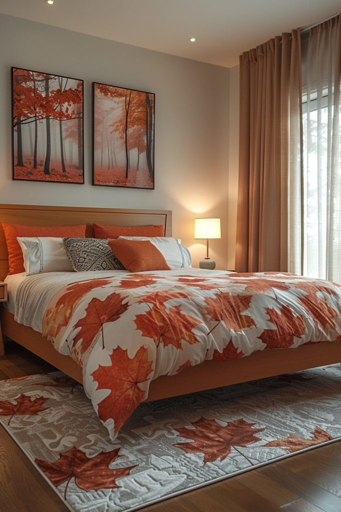 A Maple Leaf Hideaway is a fall bedroom that pays homage to the iconic symbol of autumn, the maple leaf. The room features beautiful maple leaf prints in the artwork and textiles, bringing the vibrant reds and oranges of the season indoors. Furniture and accents made from maple wood complement the natural theme. Soft, plush bedding and perhaps even a maple-scented diffuser can enhance the full sensory experience of fall in this cozy hideaway.