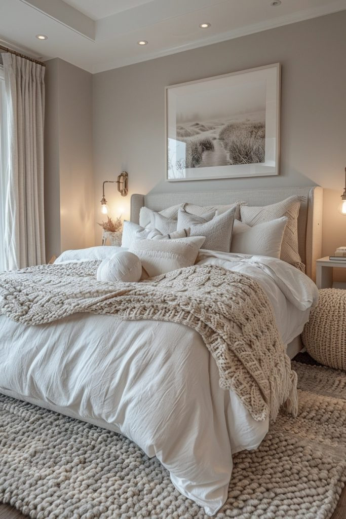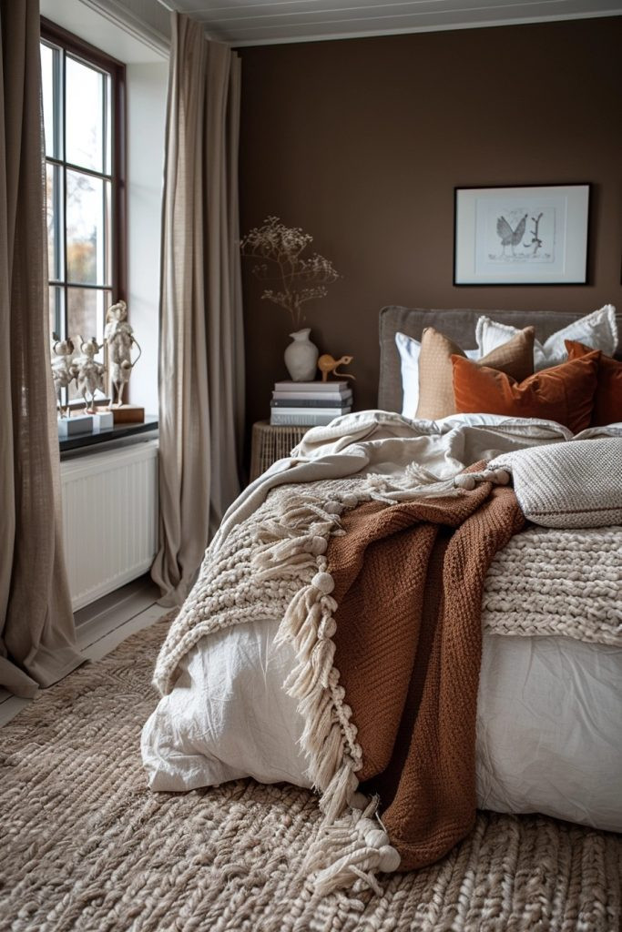 For the ultimate cozy statement, make a chunky knit blanket the star of your bedroom. This design is all about celebrating this iconic fall texture. Choose an oversized, hand-knitted blanket in a warm, autumnal color like mustard yellow, burnt orange, or a creamy off-white. Drape it generously over your bed, letting it cascade onto the floor. The rest of the bedding can be simple linen or cotton to let the blanket’s incredible texture stand out. This single element instantly adds a profound sense of warmth, comfort, and handmade charm to the room.