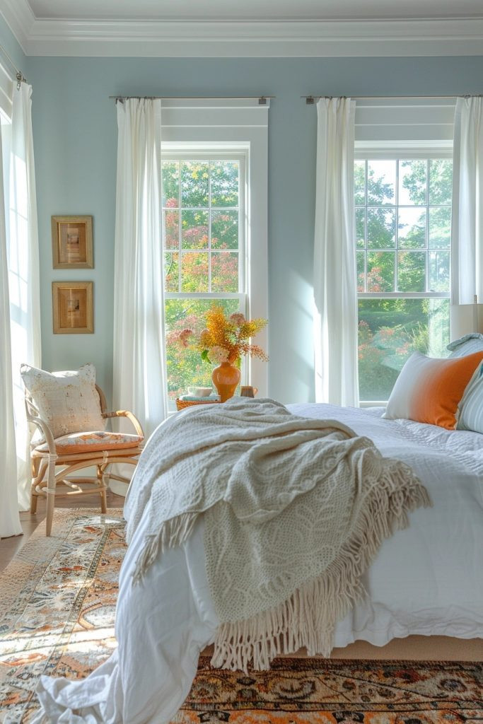 A Crisp Autumn Morning bedroom is designed to capture the essence of a fresh, cool autumn morning. A color palette of pale blue and soft grey mimics the morning sky, with small touches of orange to signify the rising sun. Lightweight curtains flutter in the gentle breeze, allowing natural light to refresh the space. A comfortable reading nook with a plush chair and a collection of soft throw blankets invites quiet, peaceful relaxation.