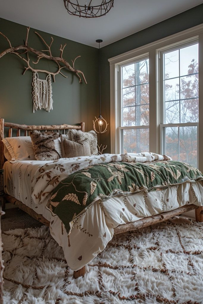 Woodland Wonder is a fall bedroom that brings the deep tranquility of the forest indoors. It features a rich color palette of earthy greens and browns, complemented by natural wood furniture and forest-inspired decor. The bed might have a headboard with a leaf pattern, and the bedding could be a deep, mossy green. Soft, ambient lighting and perhaps even a nature-sounds machine can enhance the immersive, forest-like atmosphere, creating a truly peaceful escape.