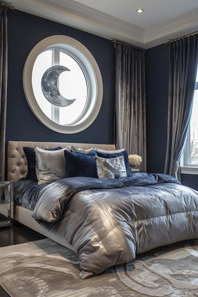 A Harvest Moon Sleep Space is a bedroom that draws its inspiration from the beautiful, bright harvest moon of autumn. The room’s color scheme features deep, night-sky blues and shimmering silvers, with moon-themed artwork and accessories. A large, circular mirror can mimic the full moon and reflect light beautifully. Silver-threaded bedding and crescent moon-shaped pillows can add further celestial touches to this magical, nocturnal theme.