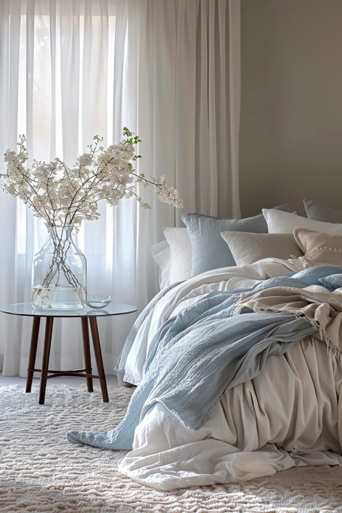 A Misty Morning bedroom evokes the serene, quiet ambiance of a foggy autumn dawn. A palette of soft pastels and whites creates a muted backdrop, with subtle pops of color like a soft pink or muted orange reflecting the emerging morning sky. Lightweight, airy curtains enhance the misty, ethereal feel, and a small humidifier can even add a gentle mist to the room. Plush, soft bedding encourages a peaceful, dreamy slumber.