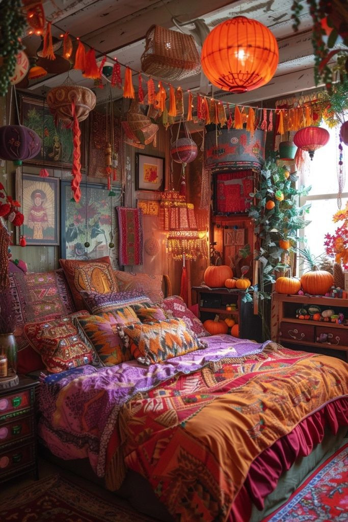 A Harvest Festival bedroom is designed with the excitement and richness of a local harvest festival in mind. The room features a bold color palette of red, orange, and gold, with patterns that reflect traditional festival motifs, like plaid and patchwork. Decorative cornucopias filled with gourds and small pumpkin displays bring the harvest indoors. Festive lighting, perhaps with strings of amber-colored bulbs, and celebratory bunting add to the cheerful atmosphere.