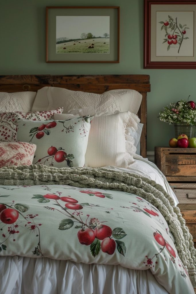 An Autumn Orchard bedroom draws its inspiration from the fruitful orchards of fall. The decor includes apple and pear prints in the art or textiles, with a color palette of fresh greens, rich reds, and golden yellows. Rustic wooden furniture and wicker baskets for storage add to the orchard feel. A juicer and a bowl of fresh, seasonal fruits on a dresser can provide a touch of practicality and charm. The bedding is soft and inviting, perfect for relaxing after a day of apple picking.