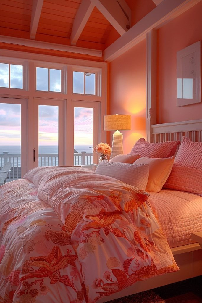 A Sunset Glow Sanctuary bedroom is designed to capture the breathtaking, fleeting colors of an autumn sunset. The walls are painted in beautiful, soft hues of orange, pink, and dusky purple. The bedding might feature a subtle sunset print or be layered in these colors. Decorative lamps with warm, amber-colored bulbs cast a golden light throughout the room, mimicking the sun’s last rays. A comfortable window seat offers the perfect spot to watch the real evening sky.